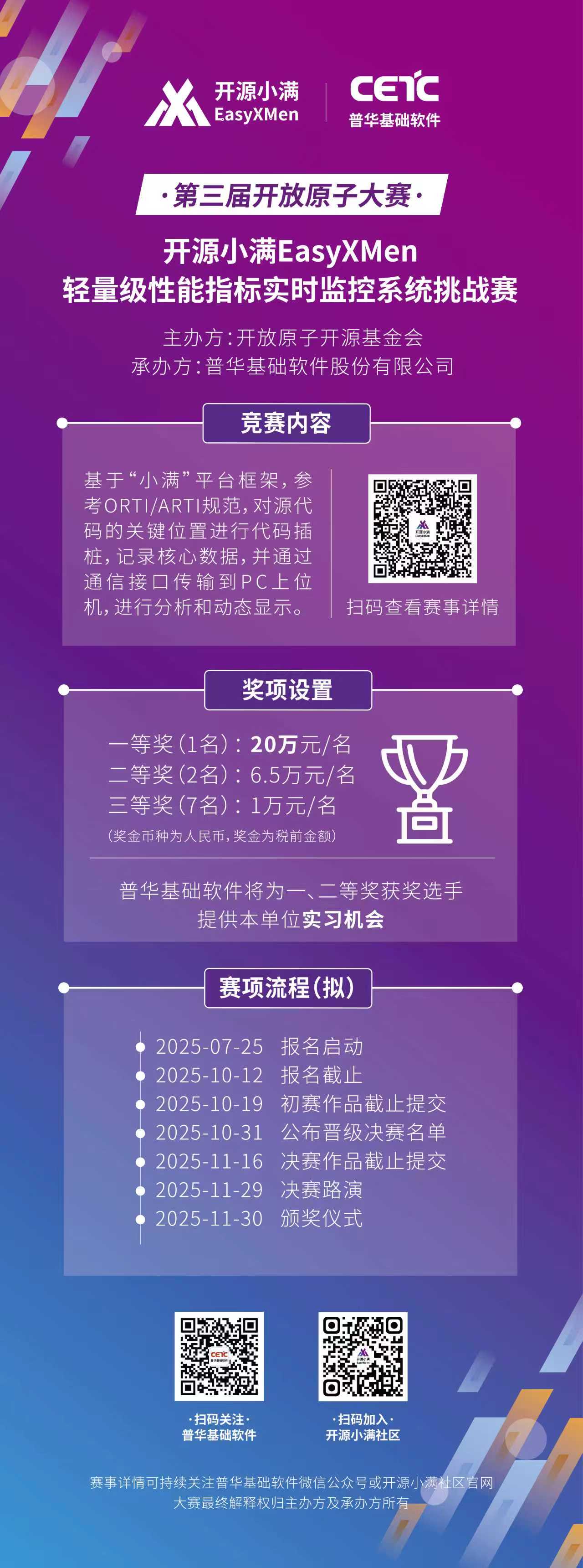 2025年7月25日,由开放原子开源基金会主办,普华基础软件股份有限公司承办的开放原子大赛——开源小满EasyXMen轻量级性能指标实时监控系统挑战赛正式启动,旨在汇聚广泛嵌入式开发者的智慧和创造力,以“轻量级性能监控”为突破点,对操作系统实时性能分析技术开展深度探索,为我国汽车电子领域培育核心基础设施研发力量。