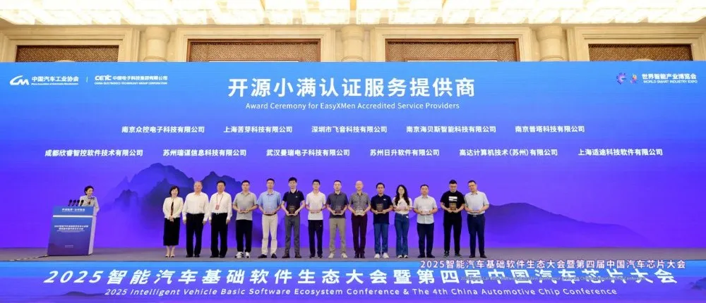会上,开源小满EasyXMen牵头发布单位普华基础软件正式为飞音科技、苦芽、众控等11家“开源小满认证服务商”授牌,为14位开源小满首批认证工程师颁发证书。开源小满社区将持续完善生态服务网络、构建高质量人才梯队,为智能汽车开源软件发展注入动能。