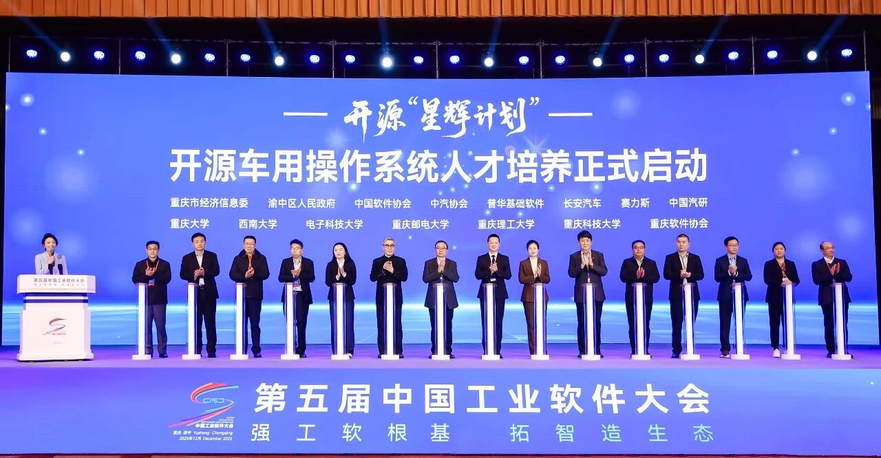 2025年12月9日上午,第五届中国工业软件大会在重庆渝州宾馆隆重开幕。作为大会开幕式重要环节,由普华基础软件发起并联合重庆市经济和信息化委员会、重庆市渝中区人民政府、中国软件行业协会、中国汽车工业协会、重庆软件协会、长安汽车、赛力斯、中国汽研、重庆大学、西南大学、电子科技大学、重庆邮电大学、重庆理工大学、重庆科技大学等15家单位共同推动的“开源星辉计划·开源车用操作系统人才培养启动仪式”正式举行,标志着我国在智能网联汽车开源软件人才生态建设方面迈出关键一步。